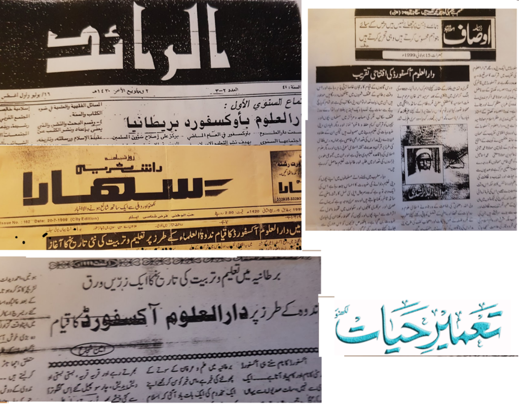 The local press covered the story as follows: Shaikh Abul Hasan Ali Nadwi (رحمه الله) explained to the annual general meeting of Nadwatul Ulama that “Moulvi Mohammad Riyad Nadwi , resident of Oxford, has made the intention to establish an institution like Dar al-Ulum Nadwatul Ulama in Oxford” (Tameer e Hayat, published 10/11/1994. Lucknow, UP, India).